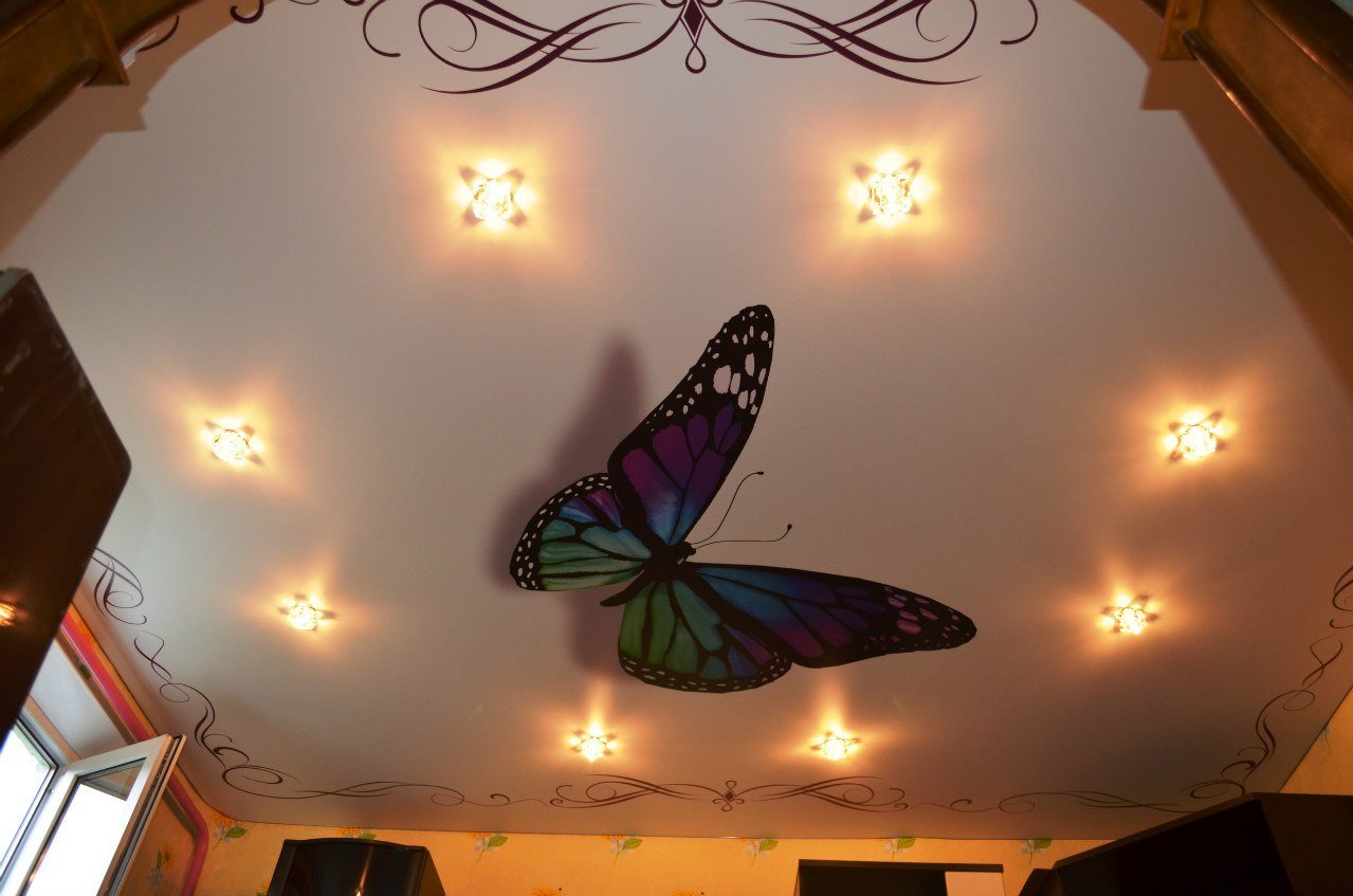 Добрый день! Первый раз натяжной потолок мы сделали в одной спальной комнате, потолки заказали белые, глянцевые. Конечно, очень переживали за результат, ведь это был наш первый опыт, а потом такие потолки в то время являлись большой редкостью. Установили их, буквально, за пару часов. При этом, ребята и люстру вернули на место. Но сколько было грязи пыли, не передать. И всё от того, что сверлятся бетонные стены. Именно поэтому обои мы клеили уже потом. А через год пришла пора наводить красоту в прихожей. Здесь я загорелась идеей сделать арт-потолок, то есть, потолок с рисунком. Задумано - сделано. Вызвала я опять тех же мастеров, ведь с их замечательной работой мы уже познакомились. Ребята привезли мне каталоги, каких только потолков не было, огромное море самых разных картинок, глаза просто разбегались от такого изобилия. Но вот я увидела бабочек и всё. Я поняла, что это самое то. Вот здесь заказ пришлось ждать три недели, это время было необходимо для создания качественного рисунка, тем более, что наша прихожая состоит из двух коридоров. Но наконец долгожданный день настал и мы получили такую красоту! Прошло уже два года, а я всё никак не могу на них налюбоваться. Да и все, кто впервые видит такие необычные потолки, сначала впадают в ступор. У нас теперь в любую погоду и в любое время года летают прекрасные, нежные бабочки.